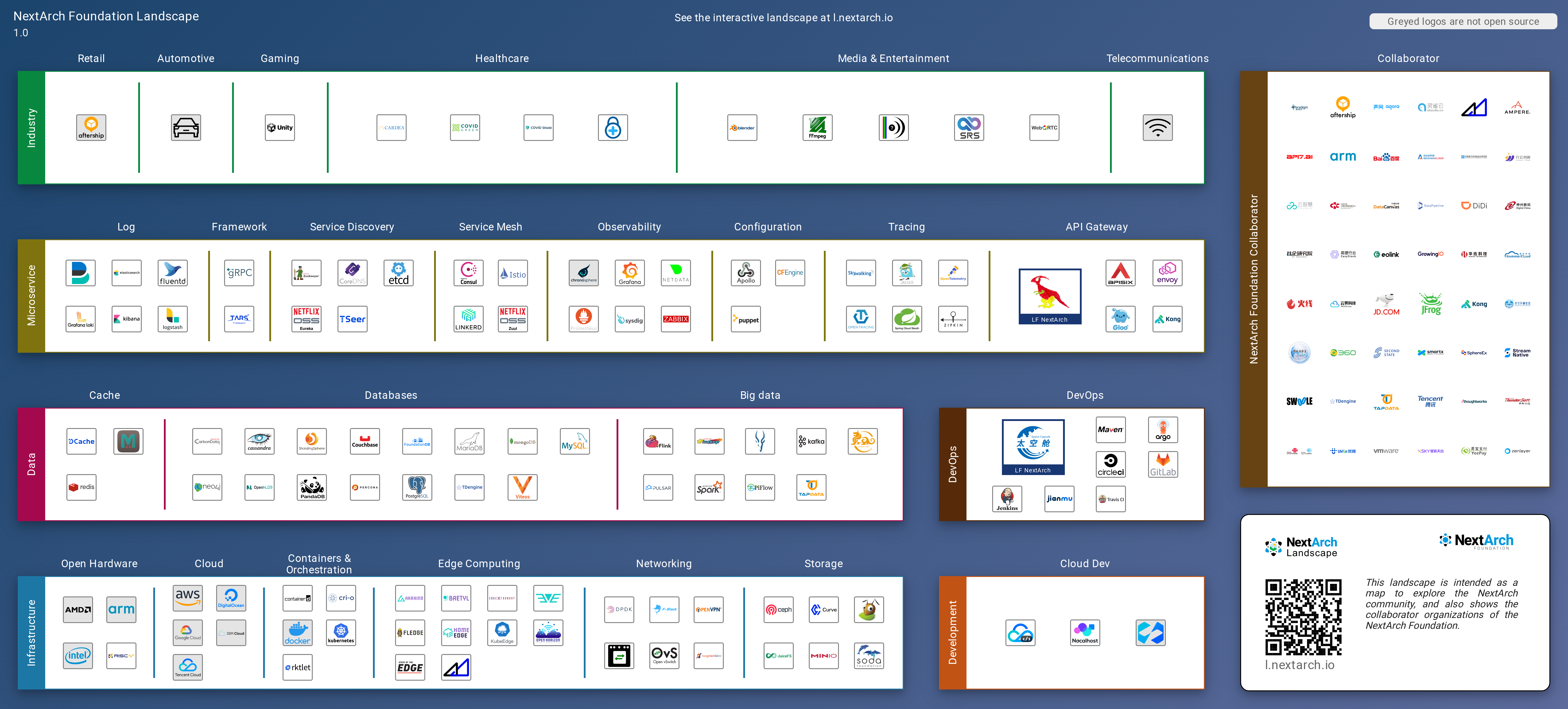 The NextArch Foundation landscape (png, pdf) is dynamically generated below. It is modeled after the CNCF landscape and based on the same open source code. Please open a pull request to correct any issues. Greyed logos are not open source. Last Updated: 2022-09-14T08:51:39. This landscape is intended as a map to explore the NextArch community, and also shows the collaborator organizations of the NextArch Foundation.